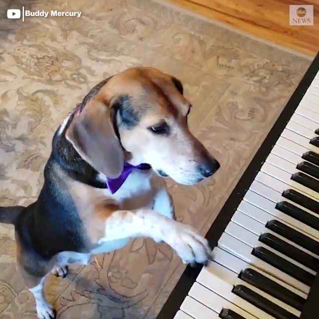PUPPY PIANIST: A dog wearing a purple bowtie sang his heart out as he hit the keys and howled the high notes much to the delight of his owner.